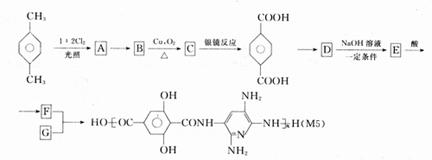 前后防护板中含有M5纤维。M5纤维是刚杆形又有强力分子间氢键的聚合物。下面是M5纤维的合成线路:(有些反应未注明条件)