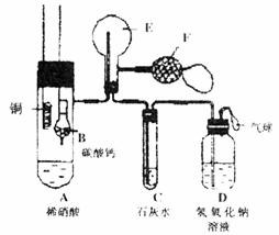 28.(9分)为了证明铜与稀硝酸反应产生一氧化氮,某同学设计了一个实验,其装置如图所示(加热装置和固定装置均已略去),B为一个用金属丝固定的干燥管,内装块状碳酸钙固体;E为一个空的蒸馏烧瓶;F是用于鼓动入空气的双连打气球。(1)实验时,先将B装置下移,使碳酸钙与稀硝酸接触产生气体,当C产生白色沉淀时,立刻将B装置上提,使之与稀硝酸分离。该组学生设计此步操作的目的为_________________________。