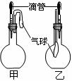如图所示的甲、乙两个装置中,胶头滴管中吸入某种液体,平底烧瓶中充入(或放入)另一种物质,挤压胶头滴管加入液体,一段时间后两装置中的气球都有明显地胀大(忽略液体体积对气球的影响)。则所用试剂分别可能依次是( )