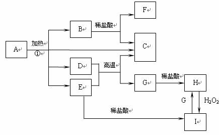 已知:A中含二种阳离子和一种带二个单位负电荷的阴离子,三种离子的个数比为3︰1︰3。阴离子中各元素的质量分数与C相同且式量是C的2倍。C.D都为气体且含有元素种类相同,C能使澄清石灰水变浑,E是一种红棕色的颜料,F的焰色反应呈紫色,I能使苯酚溶液显紫色。