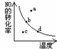反应中NO的转化率与温度的关系曲线。图中标有a、b、c、d等四点,其中表示未达到平衡状态,且V(正)>V(逆)的点是( )