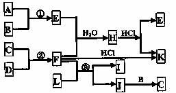 22.(8分)下图是部分短周期元素的单质及其化合物的转化关系图(有关反应条件及生成的水已略去),已知:A、B、C、D为四种非金属单质,其中B、C、D在常温常压下是气体;反应①②是化工生产中的重要反应;化合物E是形成酸雨的污染物之一,化合物K是常用的氮肥,化合物L具有漂白性,可由Cl2与NaOH反应而制得,J由两种元素组成,其相对分子质量为32。按要求填空: