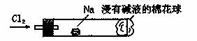 5.“绿色化学实验”进课堂,某化学教师为“氯气与金属钠反应”设计了如下装置与操作以替代相关的课本实验。实验操作:钠与氯气反应的装置可作如下图改进,将一根玻璃管与氯气发生器相连,玻璃管内放一块黄豆粒大的金属钠(已吸净煤油),玻璃管尾部塞一团浸有NaOH溶液的棉花球。先给钠预热,到钠熔融成圆球时,撤火,通入氯气,即可见钠着火燃烧,生成大量白烟。以下叙述错误的是: ( )