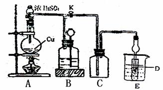 (1)请写出Cu与浓H2SO4反应的化学方程式: 。装置E中D内盛品红溶液,当C中气体集满后,D中有可能观察到的现象是 实验装置D有可能造成环境污染,试用最简单方法加以解决(实验用品自选) 。装置B的作用是贮存多余的气体。当D处有明显现象后,关闭旋塞K,移去酒精灯,但由于余热的作用,A处仍有气体产生,此时B中现象是 。B中应放置的液体(填字母): 。