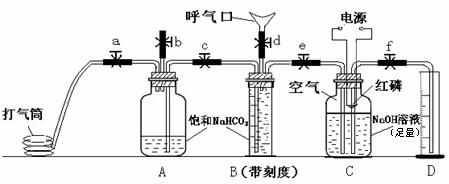 ③关闭b,打开止水夹a、c、e、f,用打气筒向A瓶中缓缓充气,直到B中气体刚好全部排出,此时量筒D中液面读数为V2ml。