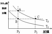 2NO2(g);△H=+57kJ·mol-1。在温度为T1、T2时,平衡体系中NO2的体积分数随压强的变化曲线如图所示。下列说法正确的是