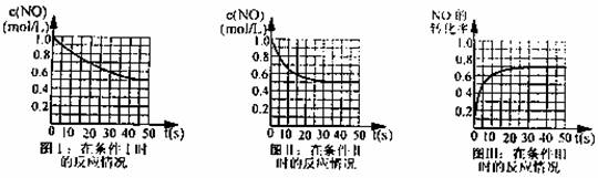 填写下列空白:反应条件I、II相比,可能的不同是 ;图III的平衡混合物中,CO2的浓度为 ;若上述反应只将NO、CO的起始浓度均改为2.0mol·L-1,仍然画出条件I~III下的NO的浓度、转化率随反应时间的变化图像,其中哪幅图像是不变的 。