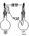 18.如下图所示的甲、乙两个装置中,胶头滴管中吸入某种液体,平底烧瓶中充入(或放入)另一种物质,挤压胶头滴管加入液体,一段时间后两装置中的气球都明显胀大(忽略液体体积对气球的影响)。则滴管和烧瓶中所用试剂可能是 ( )