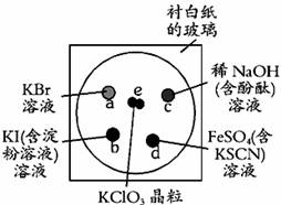 19.(6分)为了减少污染,使实验绿色化,学生按下列操作做一个实验:在一块下衬白纸的玻璃片的不同位置分别滴加浓度为0.1 mol/L的KBr、KI(含淀粉溶液)、NaOH(含酚酞)、FeSO4(含KSCN)溶液各1滴,每种液滴彼此分开,围成半径小于表面皿的圆形(如下图所示),在圆心处放置2粒芝麻大小的KClO3晶体,盖好表面皿。打开表面皿,向KClO3晶体滴加一滴浓盐酸,再立即将表面皿盖好,试描述各处反应的现象,并写出相应的离子反应方程式。