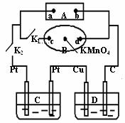 (1)关闭K1,打开K2,通电后,B的KMnO4紫红色液滴向c端移动,则电源b端为 极,通电一段时间后,观察到滤纸d端的电极反应式是 ;