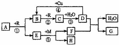 (1)若A、B、C、D、G均含X元素,且A的一个分子中只含有10个电子,G是复合肥料,则反应①、②、③是工业生产 的基本原理,M的化学式为 ;其中反应①的化学方程式为 ;反应④的离子方程式为 ;