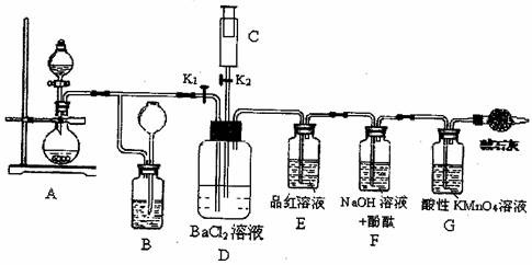 (4)装置D中无明显现象,欲使D中产生白色沉淀,关闭K1,打开K2,可将C中贮存的气体注入D中即可。则C中贮存的气体为 ,此时D中发生反应的离子方程式为 。