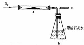 取化学式为MZ的黑色粉末状化合物进行如下实验。将MZ和足量碳粉充分混合,平铺在反应管a中,在b瓶中盛足量澄清石灰水。按图连接仪器。实验开始时缓缓通入氮气,过一段时间后,加热反应管a,观察到管内的黑色粉末状混合物中出现大量紫红色固体。同时,b瓶的溶液中出现白色浑浊。待反应完全后,停止加热,仍继续通氮气,直至反应管冷却。根据以上叙述回答问题: