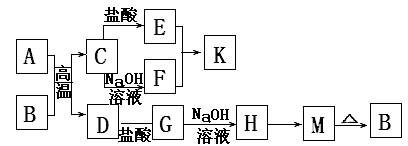 其中A、D为单质,B为红棕色固体,K为白色胶状沉淀,即可以溶于强酸溶液,又可以溶于强碱溶液。