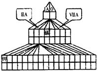 元素周期表除了我们常见的常式周期表外,还有多种表现形式。下图是元素周期表的另一种画法--塔式周期表,在上面标有部分族及部分元素。