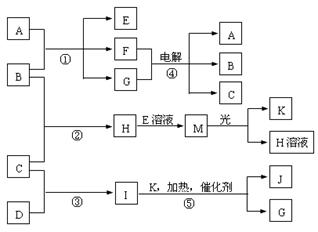 27.(12分)已知物质A是由三种元素组成的化合物,其焰色反应为黄色。B、C、D、K都是单质,反应①-⑤都是工业生产中常见的反应。各物质之间的相互转化关系如下图所示。