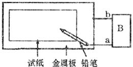 (2)若试纸为红色石蕊 试纸,金属板为一锌片,B处为一灵敏电流计,接通电路,将铅笔芯放置在试纸上一段时间,发现电流计指针发生偏转,则接触处将 (填“变白”、“变蓝”或“不变色”),铅笔芯与试纸接触处的电极反应为 。