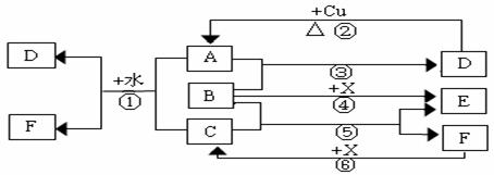 29.(12分)已知A-F是中学化学中常见物质,其中A、C、E、F为气体,B、D为液体,D的消费量常作为一个国家工业发达水平的一种标志,F的浓溶液与X共热通常用于实验室制备单质C,X是一种黑色粉末,B分子中有18个电子。反应中部分生成物已略去。试回答下列问题: