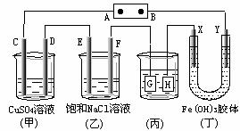 10、如下图所示的装置,C、D、E、F、X、Y都是惰性电极。将电源接通后,向(乙)中滴入酚酞溶液,在F极附近显红色。则以下说法不正确的是
