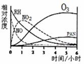 12.某研究性学习小组,为研究光化学烟雾消长规律,在一烟雾实验箱中,测得烟雾的主要成分为RH(烃)、NO、NO2、O3、PAN(CH3COOONO2),各种物质的相对浓度随时间的消失,记录于下图,根据图中数据,下列推论最不合理的是 ( )