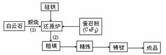 23.(10分)金属镁和镁合金在航空、汽车制造和电子工业等领域具有广泛的用途,金属镁的冶炼有多种方法,其中之一为皮江法。该方法是以白云石(CaCO3•MgCO3)为原料,经高温煅烧生成氧化物(CaO•MgO),氧化物在还原炉中经1200℃真空条件下用硅铁还原生成镁蒸汽(铁在反应前后化合价不变),镁蒸汽经冷凝器冷聚为粗镁,粗镁再经精炼、铸锭得到成品金属镁。反应工艺流程如下图:
