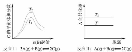 C.反应II的平衡不受压强的影响 D.若反应II中△H>0,则T2<T1