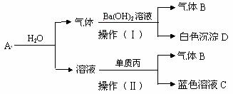 (3)若A与水反应所得酸溶液的体积为80ml、浓度为0.5mol/L,单质丙为1.92g;操作(Ⅱ)的化学方程式为 。再向其中加入20mol浓度为0.5mol/L的H2SO4,则所得蓝色溶液C中丙离子的浓度为 ;
