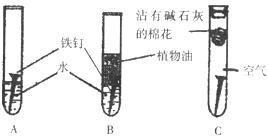 (1)甲同学设计了A、B、C一组实验(如上图),探究铁生锈的条件。经过较长时间后,甲同学观察到的现象是:A中铁钉生锈;B中铁钉不生锈,C中铁钉不生锈。