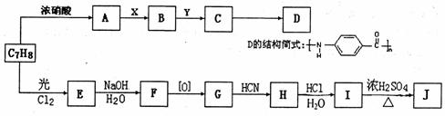 煤的干馏产物甲苯通过下列转化可以合成一种聚酰胺类高分子化合物D,以及另一含三个六元环的酯类化合物J,物质E为一氯代物: