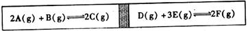 A、B、C、D、E、F的起始加入量分别为2 mol、1 mol、0 mol、X mol、Y mol、Z mol,两边反应达平衡后,隔板恰好在正中间位置。