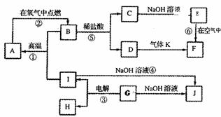 A-J分别表示中学化学中常见的一种物质,它们之间相互关系如下图所示(部分反应物、生成物没有列出),且已知G为主族元素的固态氧化物,A、B、C、D、E、F六种物质中均含同一种元素。请填写下列空白: