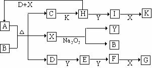 24.如下图的转化关系中,已知A是由短周期元素组成的酸式盐。D、Y、H为气体,X为无色液体,G和K均是常见的强酸。 H与Na2O2可发生化合反应,生成的盐与Ba2+反应可生成不溶于稀G的白色沉淀,一个D分子中含有10个电子。