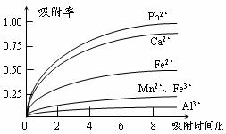 浸出液的pH<2,其中的金属离子主要是Mn2+,还含有少量的Fe2+、Al3+、Ca2+、Pb2+等其他金属离子。有关金属离子的半径以及形成氢氧化物沉淀时的pH见下表,阳离子吸附剂吸附金属离子的效果见下图。