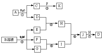 16.(8分)下图是由短周期元素组成的物质之间的转化关系。其中,A的相对分子质量为144,反应①中生成C、D物质的量之比为3∶1,D是不溶于水的白色固体,除反应③⑤外其它反应均在溶液中进行,F、G是气态非金属单质,K是一种常见的非极性有机溶剂,密度比水大。(某些生成物和反应条件已略去)。