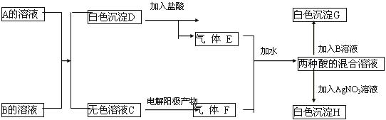 (1)A、B两种盐的化学式为:A 、B ;E、F两种气体的分子式为:E 、F 。