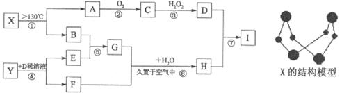 26.(12分)已知A、B、E是常见的非金属单质,其中A为淡黄色固体,Y是常见的金属单质,C的相对分子质量比A大32,D、G均是重要的工业产品,Y、F、H、I均含有同种元素。X含有两种元素,具有摇篮形的分子结构,球棍模型如图所示。H为红褐色沉淀。图中部分反应条件和产物已略去。