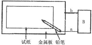 (2)如果试纸为红色石蕊试纸,金属板为锌片,B处为灵敏电流计,接通电路,将铅笔芯放置在试纸上一段时间,发现电流计指针发生偏转,则接触处将_________ (填“变白”、“变蓝”或“不变色”),铅笔芯与试纸接触处的电极反应为_________。
