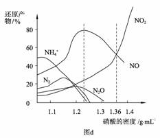 (4)金属与不同浓度的硝酸反应时,往往生成多种不同价态的还原产物。图d是各种不同密度的硝酸与铁反应时(相同温度)还原产物的分布图。