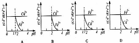 15.已知的KSP[Cu(OH)2]=2.2×10-20、KSP[Fe(OH)3]=4.0×10-38,Cu2+和Fe3+完全以氢氧化物沉淀时的pH分别为:6.7和3.2。现在向pH=0、浓度均为0.04mol·L-1的Cu2+、Fe3+溶液中加入某一固体,以中和H+调节pH(设溶液体积不变),该过程中Cu2+、Fe3+的浓度与pH关系正确的是 ( )