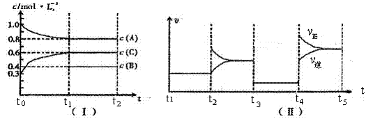 28.(13分) I、向一定体积的密闭容器中加入一定量的 A、B、C三种气体。一定条件下发生反应,各物质浓度随时间变化如图I所示,其中t0~t1 阶段c(B)变化未画出。图Ⅱ为 t2时刻后改变反应条件,化学反应速率随时间变化的情况,三个阶段改变的条件均不相同,每个阶段只改变浓度、温度、压强中的一个条件。