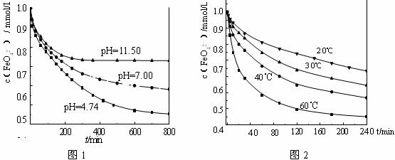 4 Fe(OH)3 +8OH-+3 O2↑。由图1可知,800min时,pH=11.50的溶液中高铁酸钾最终浓度比pH=4.74的溶液中高,主要原因是