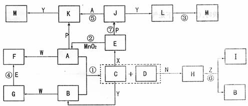 下图中,A为气体非金属单质,N、P是金属单质;N可以在CO2中燃烧,P是日常生活中最常见的金属,D是空气中含量最多的气体;B、E、Z为无色氢化物,其中B、E为有刺激性气味的气体,Z为液体;C是由三种短周期非金属元素组成的离子化合物,F、I、L为白色沉淀,其中F不溶于稀硝酸;反应②在E的浓溶液中进行,反应⑦在E的稀溶液中进行,反应②、⑦均可用于实验室制取某种气体(图中部分反应物和生成物没有列出)。