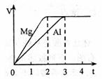 15.镁和铝分别与等浓度、等体积的过量稀硫酸反应,产生气体的体积(V)与时间(t)关系如下图。反应中镁和铝的