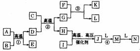 28.(15分)下图是一些常见元素的单质或化合物之间的转化关系,已知A、C、D、F、G、M、N均为氧化物,B、E、H、I、L均为非金属单质,其中D、G、H、I、J、L、M、N在常温下为气态。已知A为光导纤维的成分,F、K的焰色反应为黄色。反应①是工业制粗硅的反应,反应③是呼吸面具和潜水艇里氧气来源的反应(图中某些生成物已略去)。