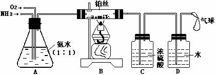 (4)若采用上述的不完善装置进行实验,同时不考虑气体在装置中的残留,实验结束时,实际测得D中有1.0 mol/L 的HNO3溶液150 mL,气球中收集的混合气体体积为1400 mL(标准状况),其中NO2、O2与N2的体积比为2∶2∶1,则氧化成NO的氨与被氧化的氨的体积比为 。
