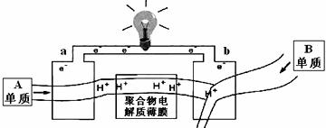 (4)下图为一含聚合物电解质薄膜的燃料电池的原理示意图,所用原料是A、B单质,则通过灯泡的电流方向是______,正极的电极反应式是______________。