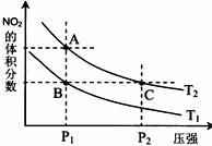 2NO2(g),在温度为T1、T2时,平衡体系中NO2的体积分数随压强变化曲线如下图所示。下列说法正确的是