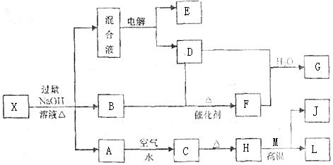 有一化合物X,其水溶液为浅绿色,可发生如下的转化关系(部分反应物、生成物已略)。其中,X与过量NaOH溶液反应,生成的A、B物质的量之比为1:2。B、D、E、F均为无色气体,M、L为常见的金属单质,在混合液中加入BaCl2溶液可生成不溶于稀盐酸的白色沉淀,H和M反应可放出大量的热。