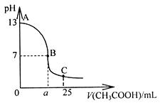 13.25℃时,在25mLNaOH溶液中,逐滴加入0.2mol·L-1CH3COOH溶液,溶液pH的变化曲线如下图所示。下列分析中正确的是( )