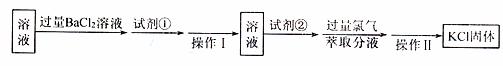 (4)某同学对该实验方案提出质疑,他认为加适量氯化钡溶液不容易控制,应该加入过量氯化钡溶液,并按照以下思路对氯化钾样品进行提纯。请填写试剂①和试剂②的名称。